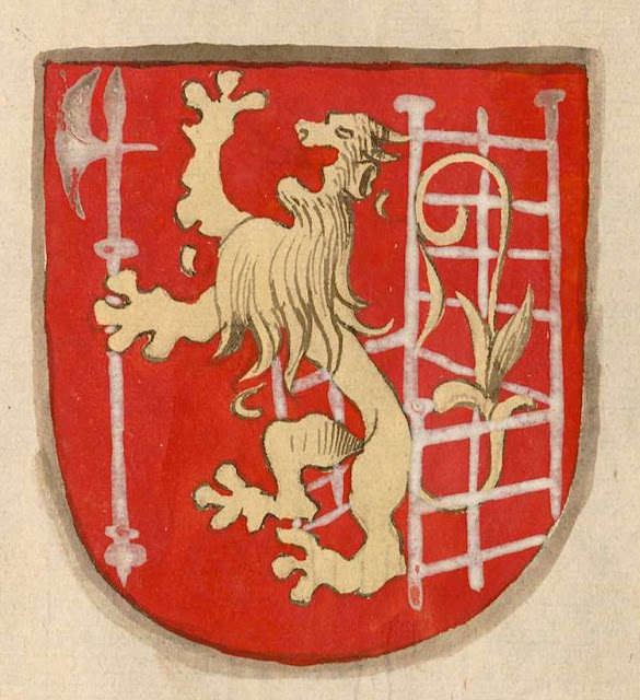 le lion assis sur le trône, tenant une hache d'armes.