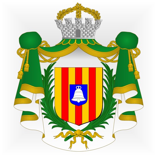 D’or, à trois pals de gueules ; sur-le-tout d’azur, à la cloche d’argent.
