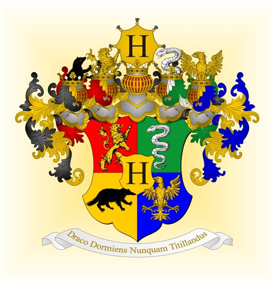 Terminant notre petit voyage dans le monde magique d'Harry Potter, nous voici maintenant à la présentation des armoiries de l'école de Poudlard (Hogwarts) elle-même. Leur blasonnement est : écartelé : 1, de Gryffondor contourné (*); 2, de Serpentard; 3, de Poufsouffle contourné (*); 4, de Serdaigle; sur-le-tout d'or, au "H" de sable. La devise est "Draco Dormiens Nunquam Titillandus" (On ne chatouille pas un dragon qui dort).