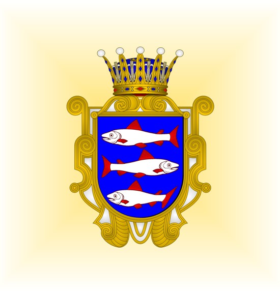 Le blasonnement des armoiries d'Angermanie (Ångermanland) est : d'azur, à trois saumons d'argent, crêté, lorré et peautré de gueules, le deuxième contourné.